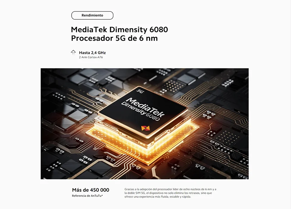Processor------ Mediatek dimension 6080,cpu: eight-core cpu, up to 2.4 ghz,gpu: mali-g57